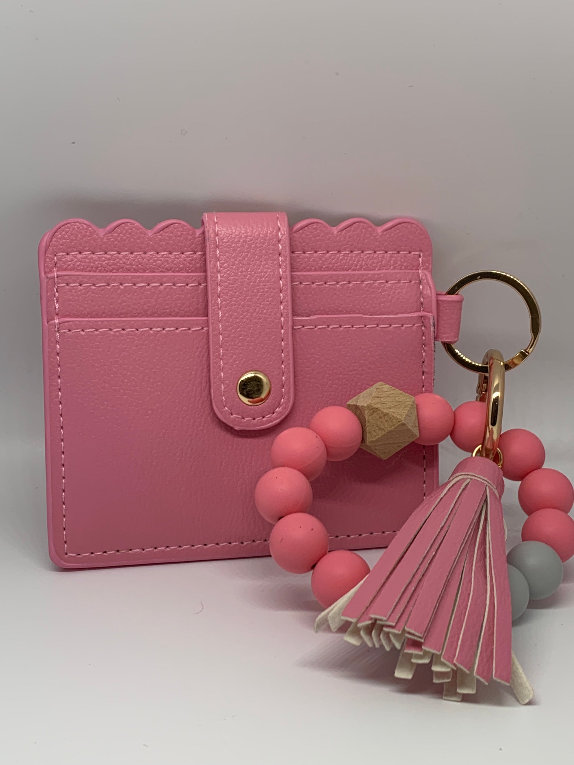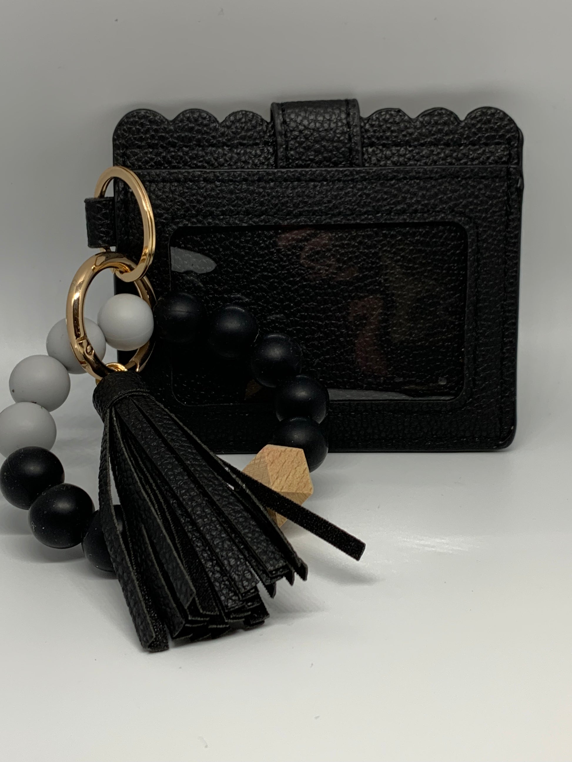 Cute faux leather card wallet with a beaded bracelet & tassel attached. It’s perfect for holding your license and a few cards while running errands. Attach your keys to the large ring and you’re good to go!