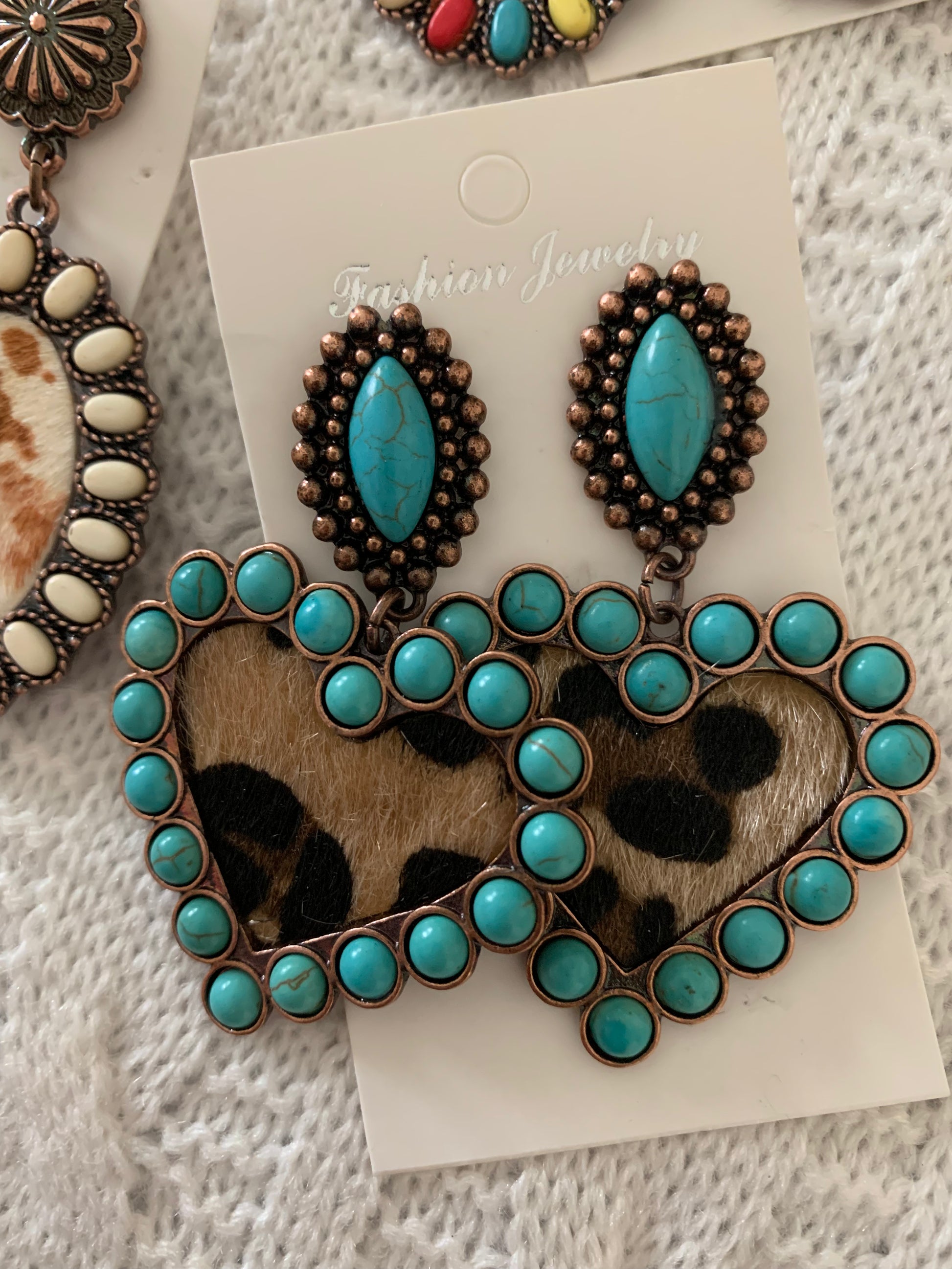 These earrings are a definite statement piece and perfect addition to your accessories! Each piece is made from metal alloy material and inset with an animal pattern made of horse hair. Available in an oval or heart shape, with cream, turquoise or multi colored stones.
