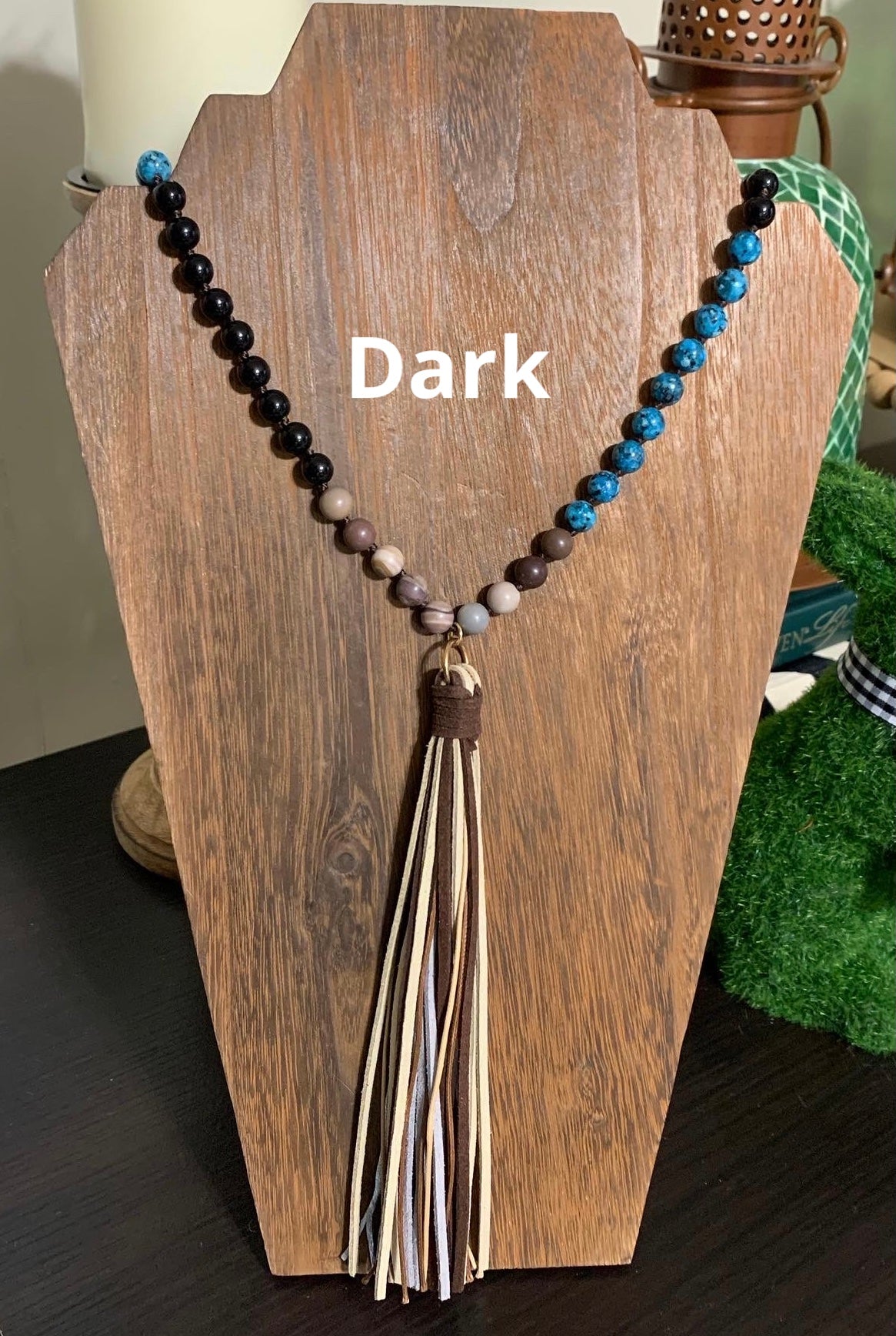 This Boho Tribal Tassel necklace is a handmade blend of wood, crystal and stone beads. The tassel is made from leather strips and ribbon. It would be a beautiful gift or treat for yourself.