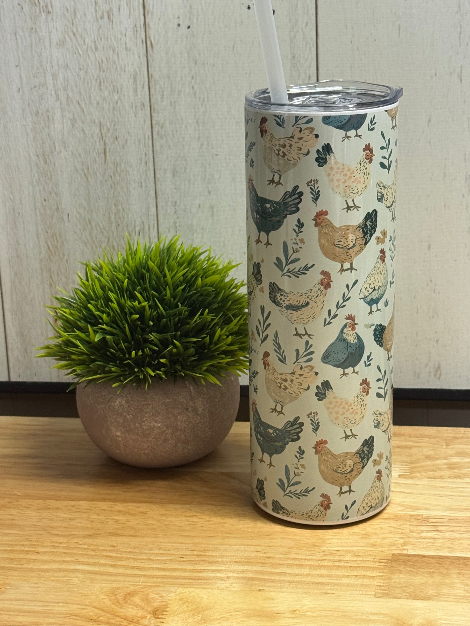The perfect gift for your chicken loving friends! It’s a 20 oz. skinny tumbler imprinted with sublimation ink. It comes with a clear lid and plastic and metal straw.