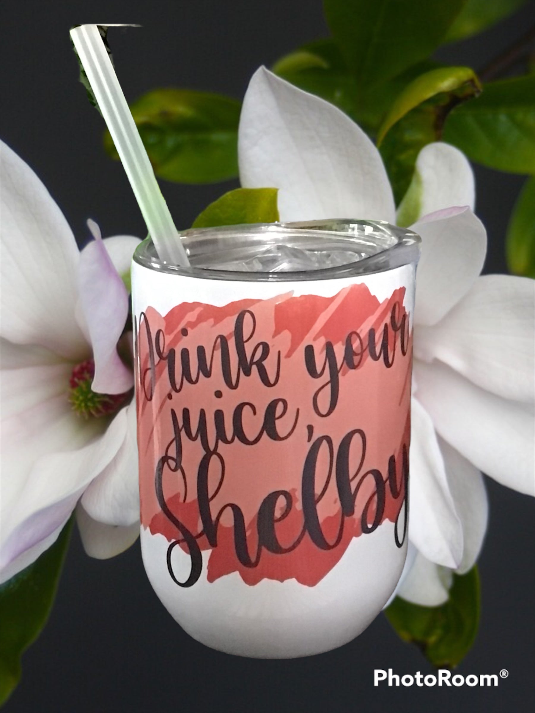 Done in our favorite colors of blush and bashful, you’ll be tickled pink with this wine tumbler. The Drink Your Juice wine tumbler will hold up to 12 ounces of your favorite libation, hot or cold. It comes with a plastic lid and straw.