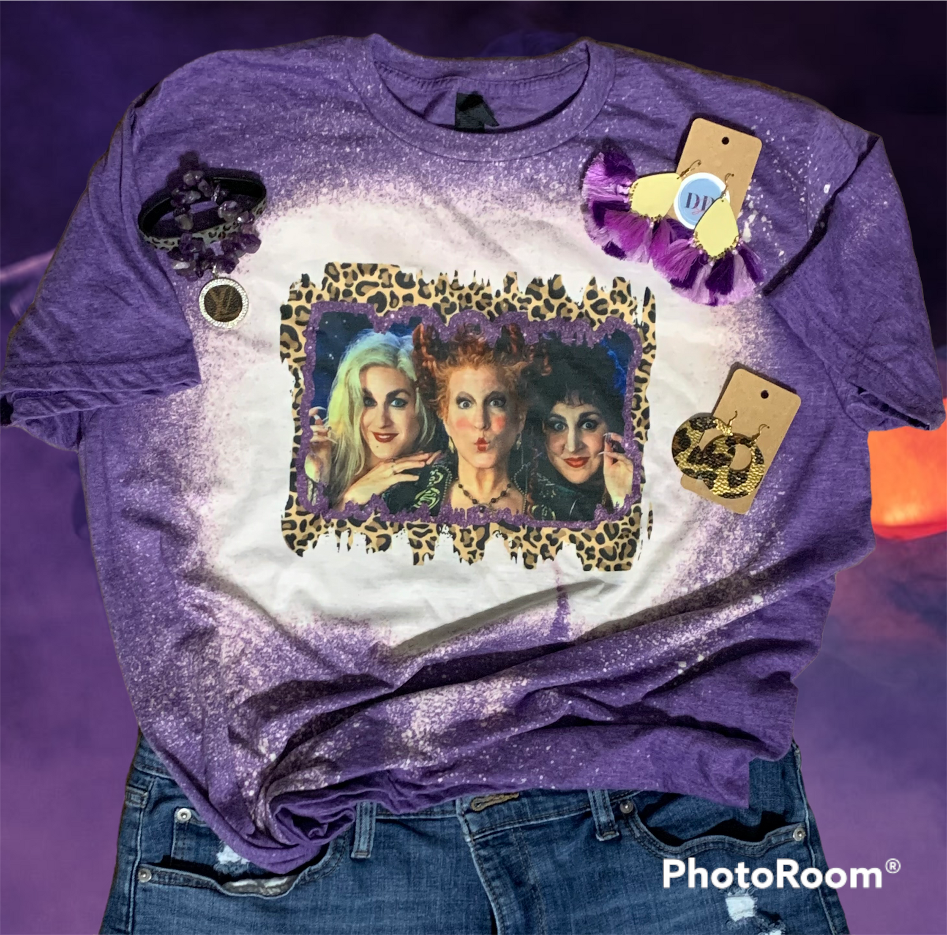 It’s Hocus Pocus y’all! You won’t need a magic book or mystical spells to look fabulous in this bleached tee featuring the Sanderson Sisters. Using either Gildan or Bella Canvas shirts, no two tees are just alike.
