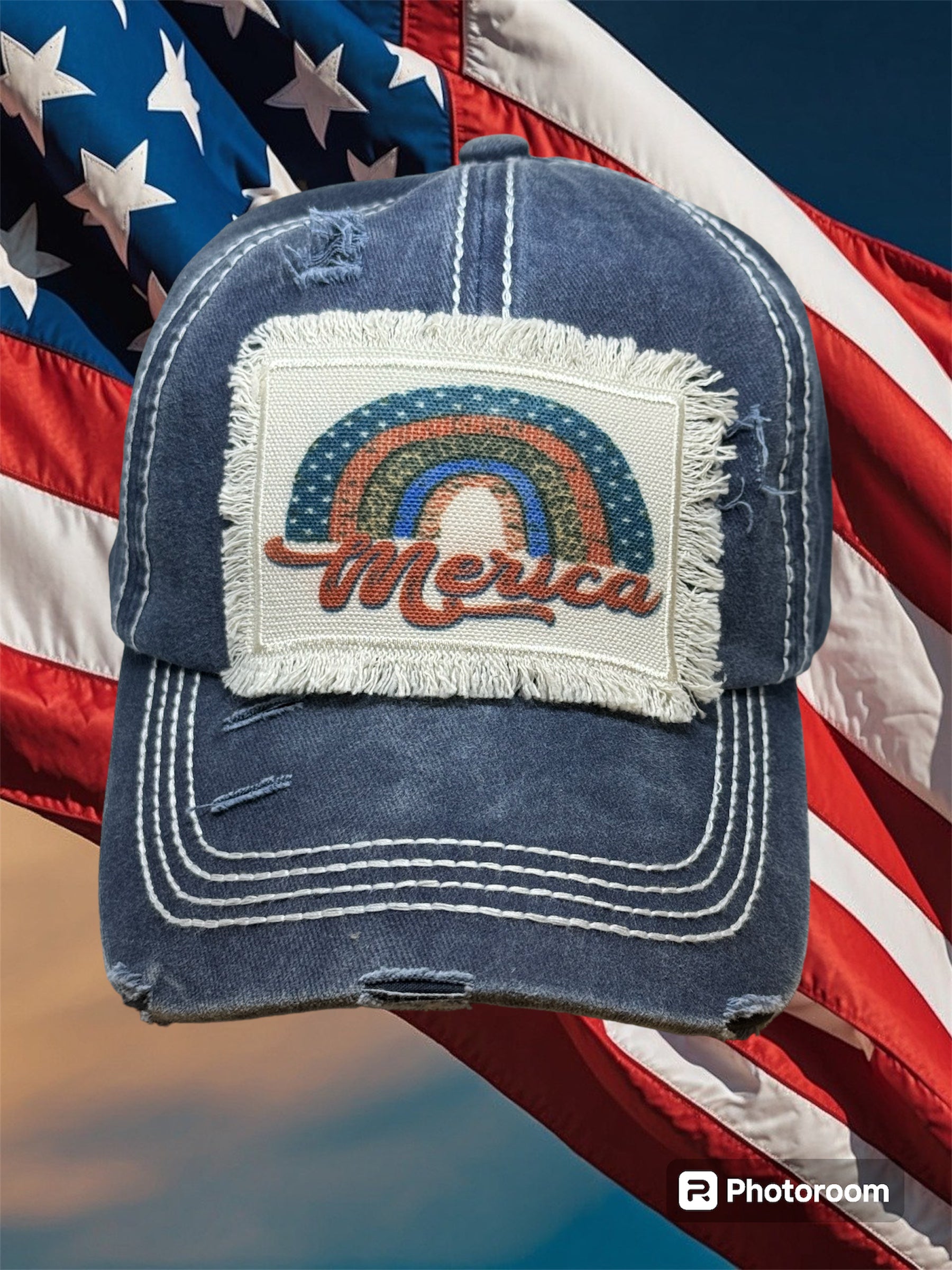 Navy distressed hat with adjustable strap. Decorated with iron-on, sublimation frayed patch.