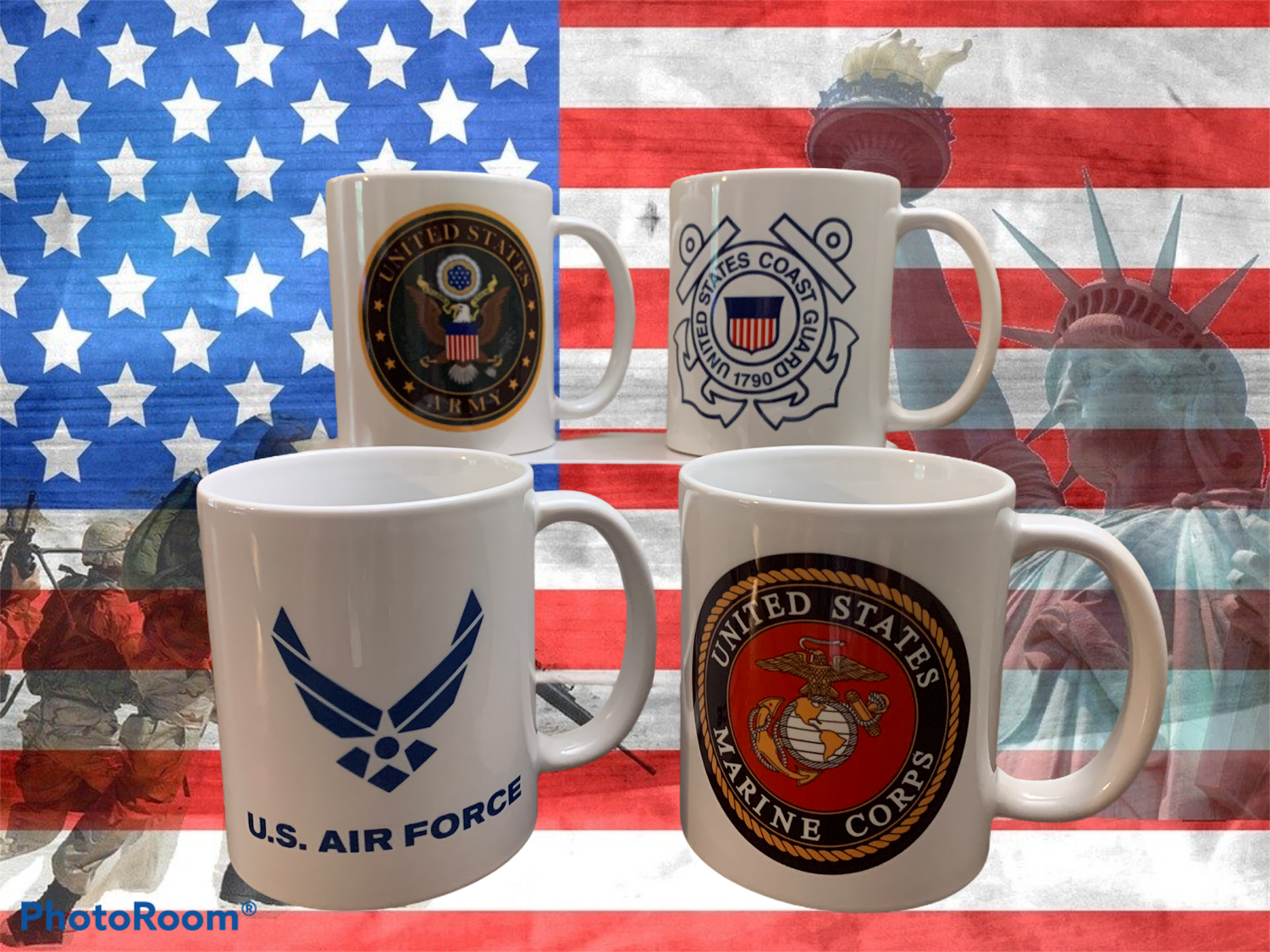 Each mug is printed with a military branch on one side and the veteran saying shown on the other.