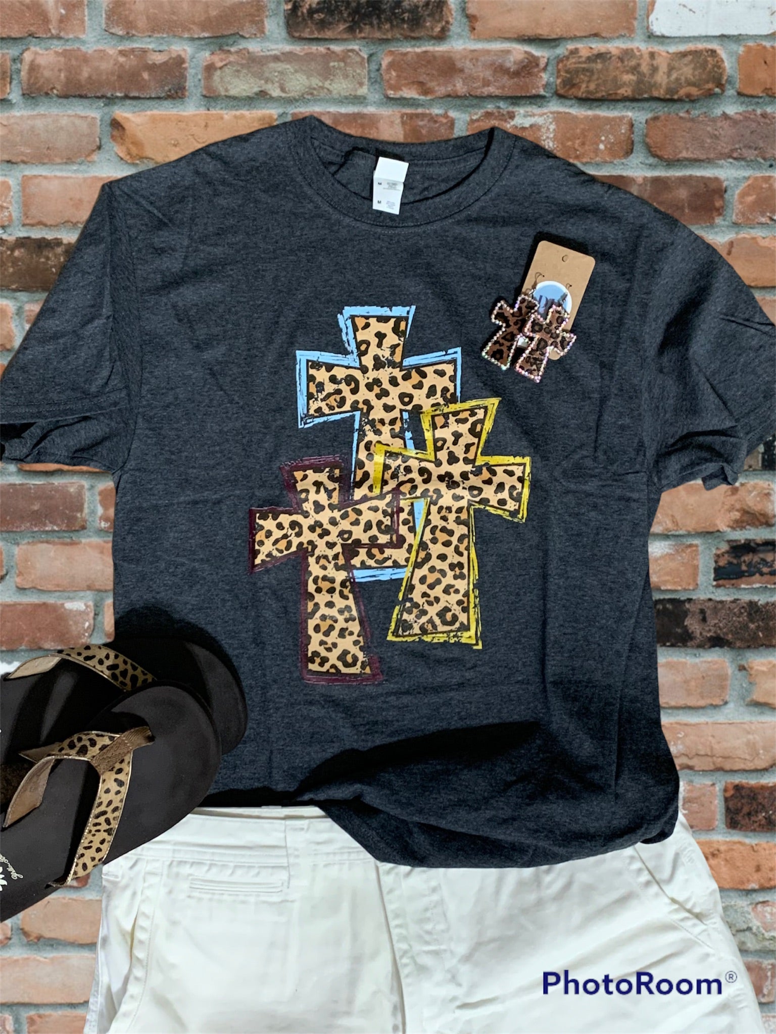 This leopard tee will become a timeless staple in your closet! The design features three distressed leopard crosses trimmed in cardinal red, ultra gold and sky blue. Pairs great with our leopard cross earrings or our Blessed hat in yellow.